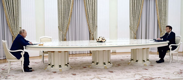 지난 7일 블라디미르 푸틴 러시아 대통령과 에마뉘엘 마크롱 프랑스 대통령의 회담이 끝난 후 이들이 앉았던 탁자가 화제가 되고 있다. 이날 마크롱 대통령은 러시아 모스크바 크렘린궁을 방문해 푸틴 대통령과 우크라이나를 둘러싼 안보 위기 해법을 논의했다.