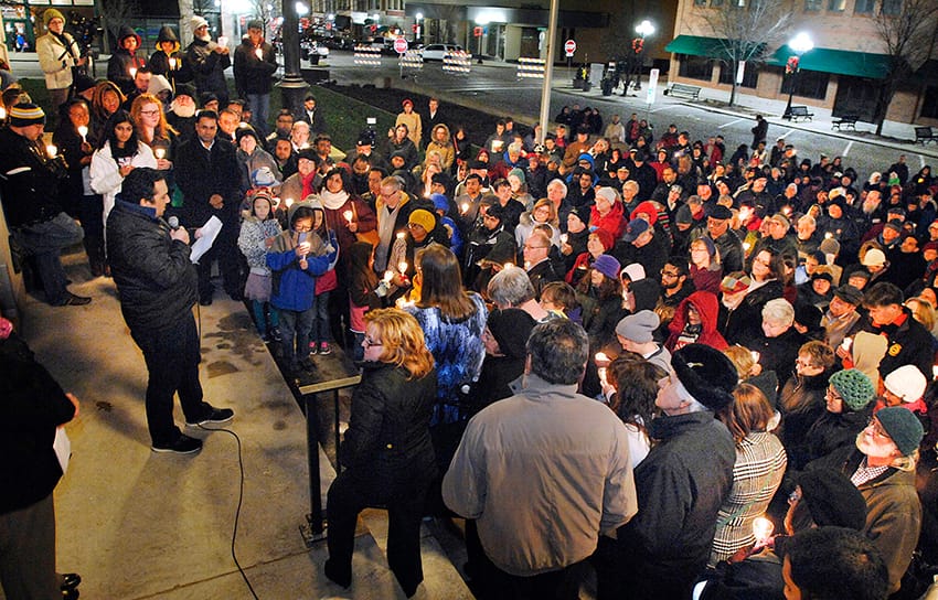 파리 테러 참사이후 고조되고 있는 이슬람교 배척 움직임과 관련해 지난 16일 일리노이주 블루밍턴에서는 수백명의 주민들이 특정 종교를 비방하지말고 모든 종교와 신도들을 아우르자는 종파초월(interfaith) 집회를 열었다.<AP>