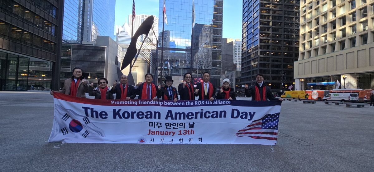 시카고한인회와 주시카고 대한민국 총영사관이 123주년 ‘미주 한인의 날(Korean American Day)’을 맞아 1월 13일, 시카고 시청 데일리 센터(Richard J. Daley Center)에 게양된 태극기 앞에서 기념식을 열고 기념촬영과 결의 행사를 진행했다. 이날 행사에서는 허재은 시카고 한인회장이 선언문을 낭독했으며, 시카고 총영사관 김인수 영사가 이재명 대통령의 축사를 대독했다. 참석자들은 한미동맹과 한인 이민사의 의미를 되새기며 미주 한인의 날의 취지를 함께 나눴다.