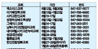유아부부터 5학년 이하의 유·초등부를 대상으로 이른 봄부터 조기등록이 시작됐지만 아직 많은 교회들이 등록생을 접수받고 있다. 8일 현재 확정된 시카고 한인교계의 여름성경학교와 여름신앙학교 일정은 다음과 같다.<홍다은 기자>