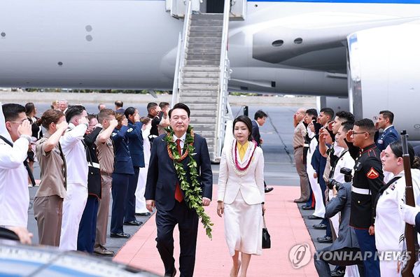 윤 대통령과 부인 김건희 여사는 이날 오후 호놀룰루 히캄 공군기지에 도착했다.