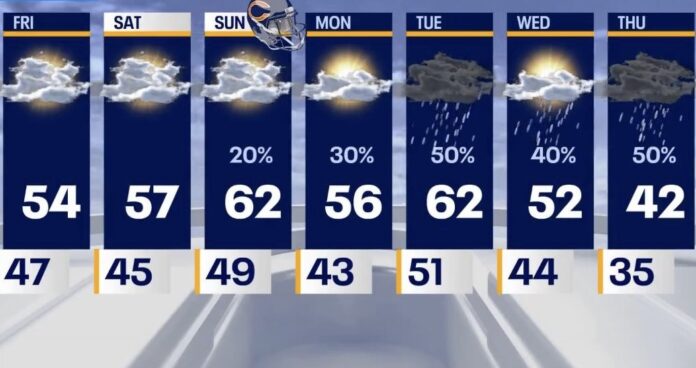 내주에 주중이 지나가면서 시카고 지역에 찬 공기가 몰려들면 낮 최고기온은 40도선으로 내려갈 것으로 보이며 비도 뿌린다.