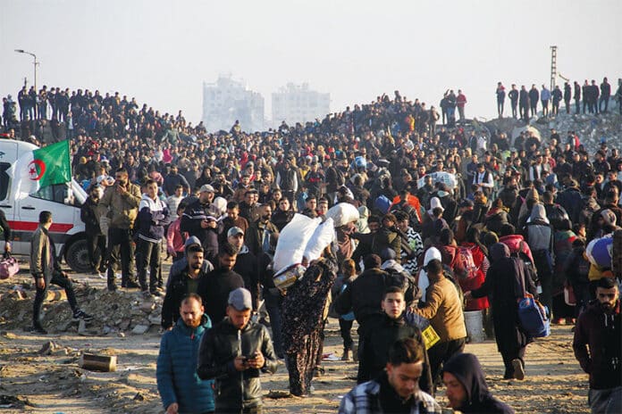 팔레스타인 피란민들이 27일 가자시티 인근에서 대거 귀향길에 오르고 있다. [로이터]