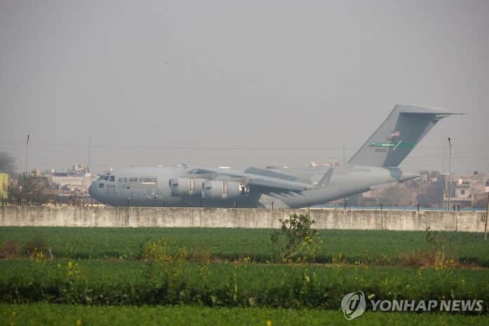 인도인 불법체류자 태운 미 군용기가 5일 인도 암리차르 공항에 착륙한 모습 [로이터 통신. 연합뉴스 자료사진. 재판매 및 DB 금지]