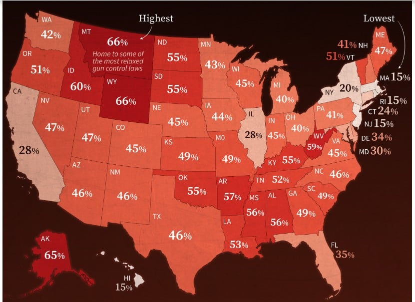 미 북서부의 몬태나주는 성인 인구의 66.3%가 총기를 소유하고 있어 미국에서 총기 보유율이 가장 높은 주로 나타났다. 몬태나주는 미국에서 가장 완화된 총기 규제법을 시행하고 있다. 라이플, 산탄총, 권총을 구매하거나 소지하는 데 주정부 허가가 필요하지 않다. 와이오밍주는 성인의 66.2%가 총기를 소유하고 있어 2위에 올랐다. 알래스카는 64.5%로 3위를 차지했다.