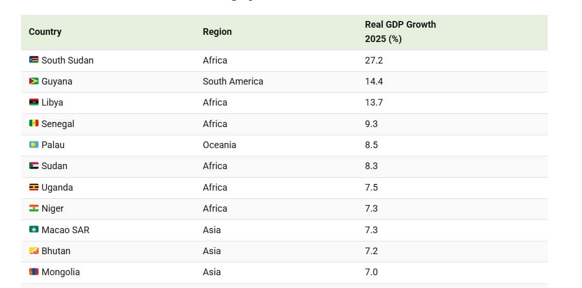 국제통화기금(IMF)이 공개한 내용에 따르면, 올해 경제성장률이 가장 높은 국가들은 당연히 개발도상국으로 주로 아시아와 아프리카에 집중돼 있는 것으로 나타났다. 아프리카 국가가 12개국, 아시아에 속해있는 나라들이 6개국으로 집계됐다.