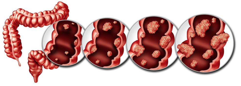 Colorectal cancer or Colon disease concept as a medical illustration with different stages of cancers in a large intestine with a malignant tumor growth disease of the digestive system as a 3D illustration.