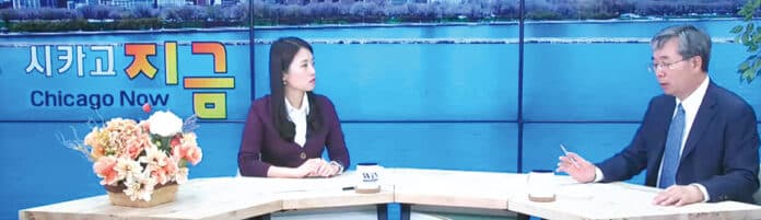WIN TV '생방송 시카고 지금의' 진행을 맡은 전혜윤 앵커가 이창환 변호사(사진 오른쪽)에게 질문을 하고 있다.