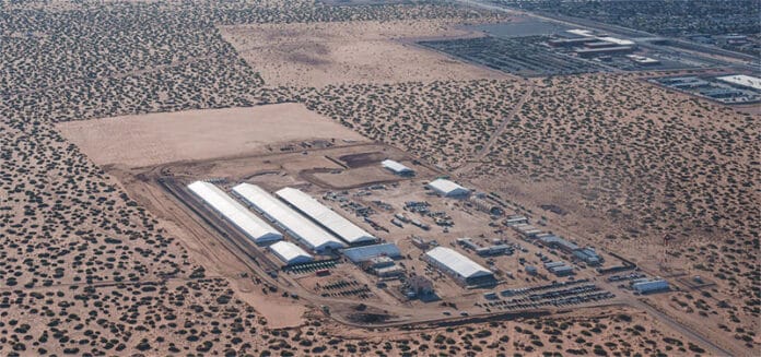 연방 이민 당국이 체포된 불법 이민자들을 수용하기 위한 이민 구치소를 확대하고 있는 가운데, 텍사스주 엘패소 지역 국경 인근 포트 블리스의 황량한 지역에 이민 구치소가 신축되고 있다. 신축 시설을 드론으로 항공 촬영한 모습.