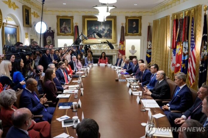 (워싱턴=연합뉴스) 박성민 이유미 특파원 = 올해 79세인 도널드 트럼프 미국 대통령이 26일(현지시간) 백악관에서 직접 주재한 국무회의가 3시간 17분간 이어지며 이례적으로 길게 진행됐다.