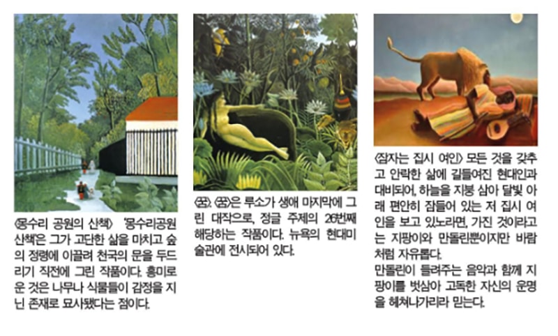 루소의 몽환적인 그림들을 보고 있노라면, 그의 무의식 속에 현실을 도피하고 싶었던 심리가 꿈과 현실을 넘나들며 그림으로 표출된 것일지도 모른다는 생각을 해본다. 갑작스레 패혈증으로 66세에 세상을 떠나기까지, 길지도 않은 그의 인생에서 두 번의 결혼생활을 통해 얻은 두 아내를 비롯해 다섯 명의 아이들까지 먼저 떠나보낸 그에게, 강팍한 세상의 삶의 강을 끊임없이 건너면서 그가 믿게 된 것은 아마도 유토피아적인 그림을 그리면서 행복을 느끼고 위로를 받았는지도 모른다. 나는 그가 ‘삶은 한여름 밤의 꿈’이라는 사실을 받아들이게 되었으리라 믿는다. 21세기에 이르러 세계 많은 미술 애호가들의 사랑을 받으며 영광의 꽃이 피고 있는, 생전에 주목받지 못한 변방의 화가, 앙리 루소의 ‘꿈’ 그림은 뉴욕 현대미술관에서 피카소, 고흐의 그림과 함께 위상을 드러내고 있다.