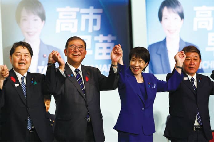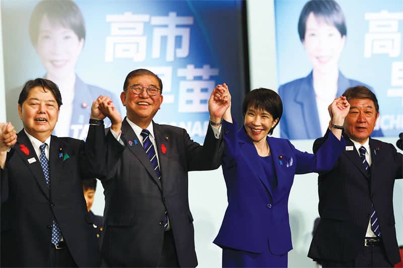 강경 보수이자 극우 성향으로 알려진 다카이치 사나에 전 일본 경제안보담당상이 4일 집권 자민당의 첫 여성 총재로 선출됐다. 그는 약 열흘 뒤에 치러질 것으로 예상되는 국회 총리 지명선거를 거쳐 사상 최초의 여성 일본 총리로 취임할 것으로 전망된다. 다카이치 당선자(오른쪽 두 번째부터)가 이시바 시게루 현 총리 등 자민당 지도부와 함께 손을 들어 기뻐하고 있다.