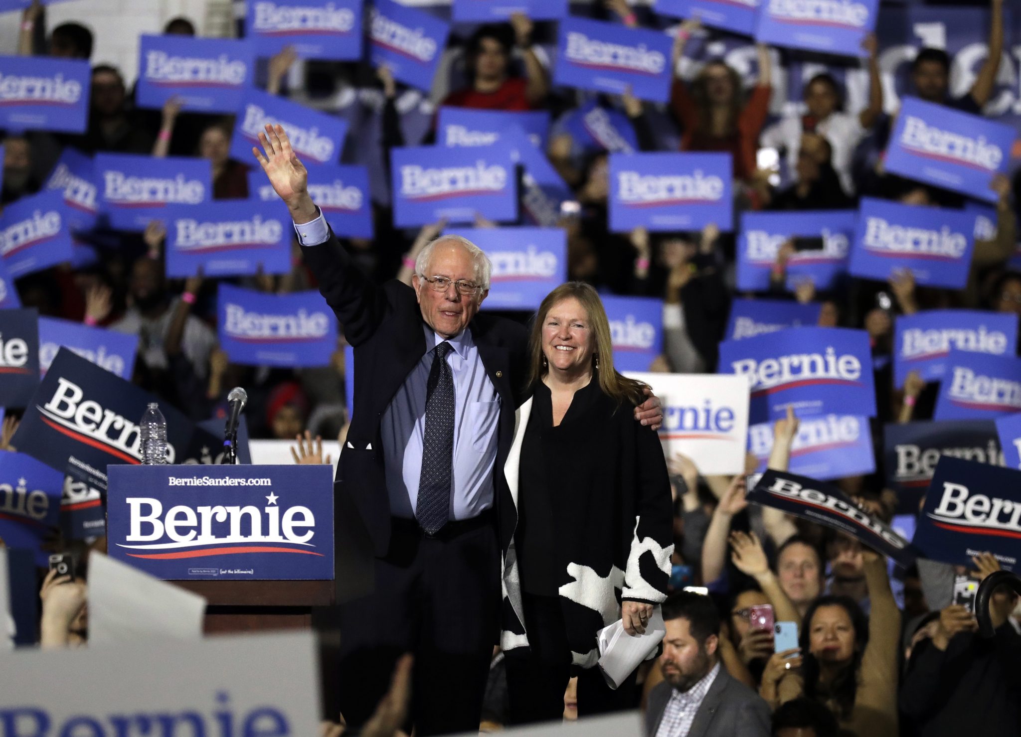 2020 민주당 대선 후보 경선 출마를 선언하고 전국을 순회중인 버니 샌더스 연방상원의원(무소속/버몬트)가 지난 3일 시카고를 찾아 다운타운 네이비피어에서 수만명의 지지자들이 참석한 대규모 집회를 가졌다. 샌더스가 부인 제인과 함께 지지자들의 환호에 답하고 있다.<AP>