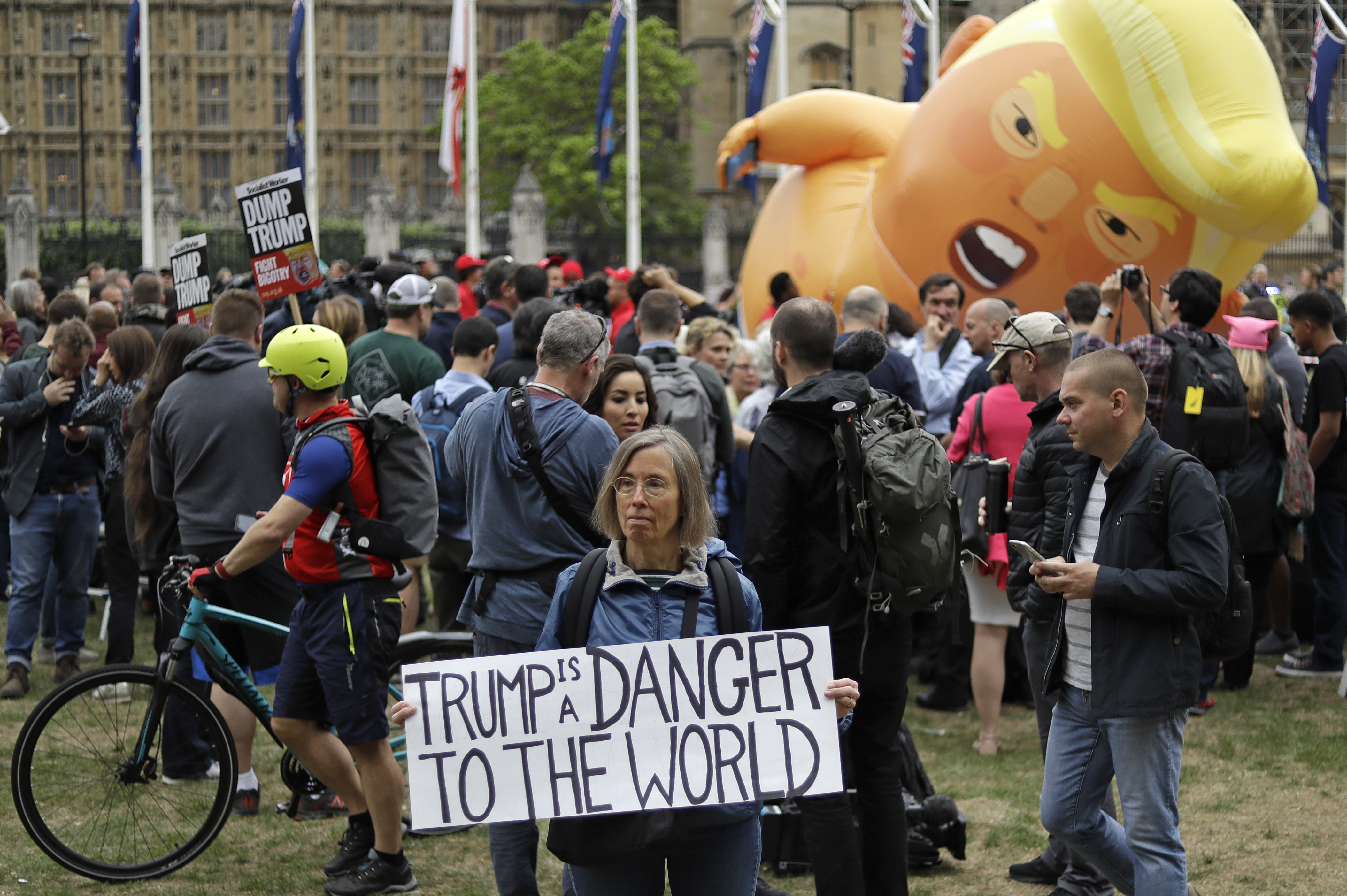 로이터통신, 가디언 등 주요 언론 보도에 따르면, 이날 영국 총리관저 인근 런던 트래펄가 광장에 수천명의 시위대가 집결했다. 이들은 여성과 동성애자, 유색인종에 차별적인 트럼프 대통령의 정책을 비판하는 플래카드 등을 내걸고 시위에 나섰다. 트래펄가 광장은 테리사 메이 영국 총리가 트럼프 대통령과 회동 중인 곳에서 불과 수백m가량 떨어진 곳에 있다.