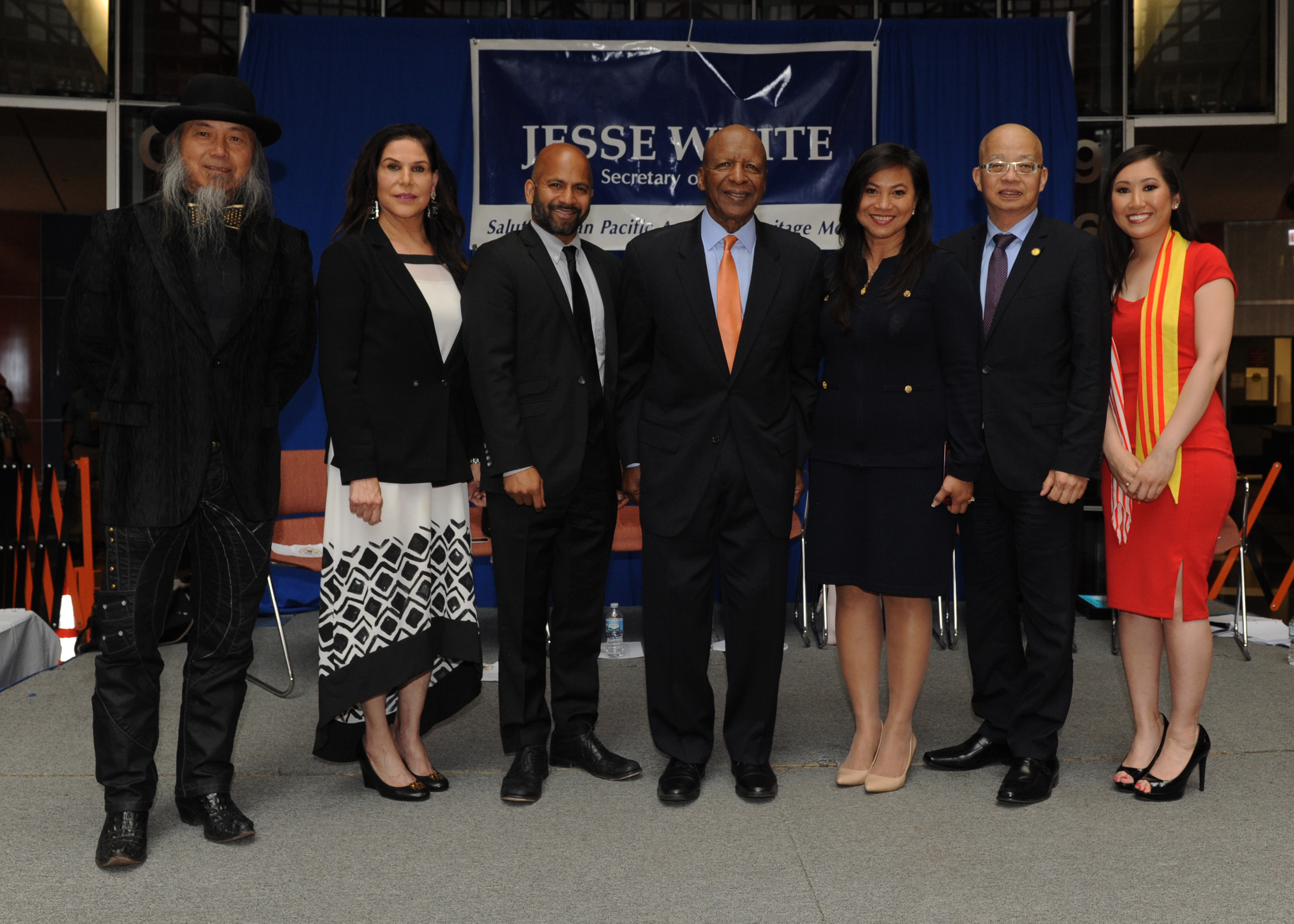 제시 화이트 IL 주총무처장관실 주관 아시안 문화유산의 달 기념식이 지난달 21일 시카고 다운타운 톰슨 주청사에서 열렸다. 화이트(중앙) 장관이 수상자들과 함께 기념촬영을 했다.<사진=총무처장관실>