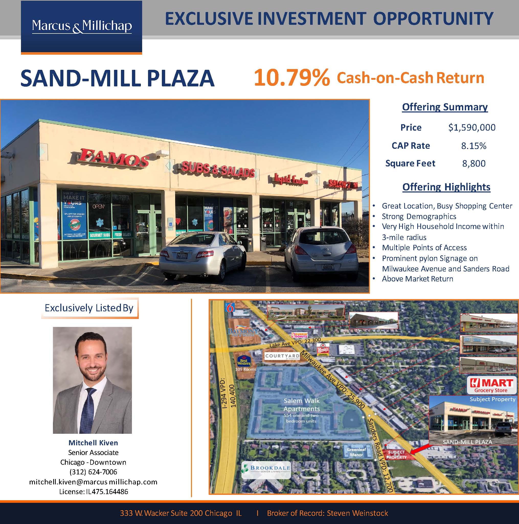 샌드밀 플라자는 활발한 상권 및 높은 인구비율, 3마일 반경 고소득 주민 밀집, 마켓 평균이상의 고수입이 보장되는 등의 특징을 가진 상업용 투자건물로 각광받고 있다.(문의: 312-624-7006)