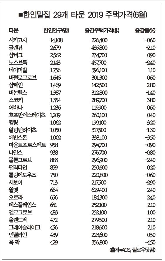 한편, 한인인구 400명 이상인 29개 타운 중에서 올 6월말 현재 중간주택가격이 가장 높은 곳은 62만9,400달러를 기록한 윌멧이었다. 이어 노스브룩(45만7,700달러), 글렌뷰(43만5,800달러), 네이퍼빌(39만6,100달러), 링컨우드(37만달러), 옥 팍(35만6,800달러), 에반스톤(33만8,100달러), 알링턴 하이츠(31만7,500달러), 버논 힐스(31만2,800달러), 버펄로 그로브(30만1,300달러) 등의 순이었다. 중간주택가격이 가장 낮은 타운은 11만9,900달러의 어바나였고,  샴페인(14만2,500달러), 오로라(18만4,300달러), 윌링(19만9,100달러), 세보이(21만7,500달러), 그레이슬레이크(21만8,600달러), 롤링 메도우즈(22만800달러), 먼덜라인(23만3,600달러), 시카고시(22만6,400달러), 샴버그(23만4,700달러) 등의 순으로 주택가격이 낮았다.<신은영 기자>