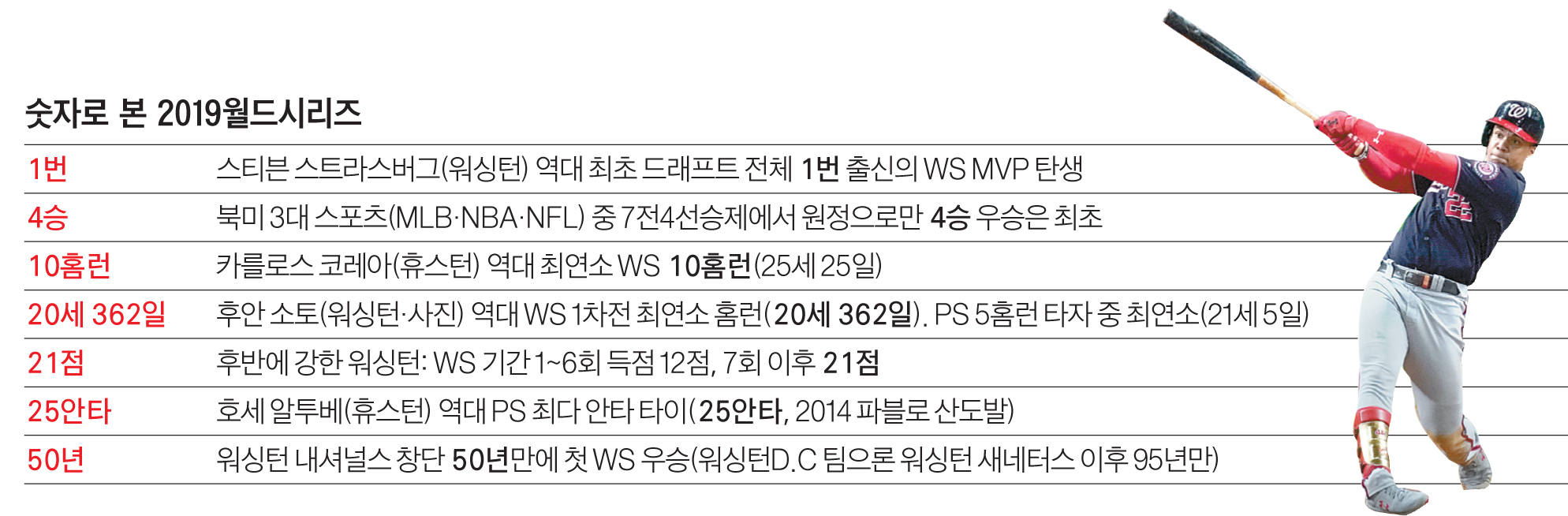 미국 프로야구 메이저리그의 포스트시즌이 시작할 때만해도 워싱턴 내셔널스의 우승을 점치는 이들은 많지 않았다. 정규시즌 전적 93승 69패로 와일드카드전에 겨우 올랐을 뿐이다. 통계사이트 팬그래프닷컴에선 워싱턴의 월드시리즈(WS) 우승 확률을 7.6%로 계산했다.