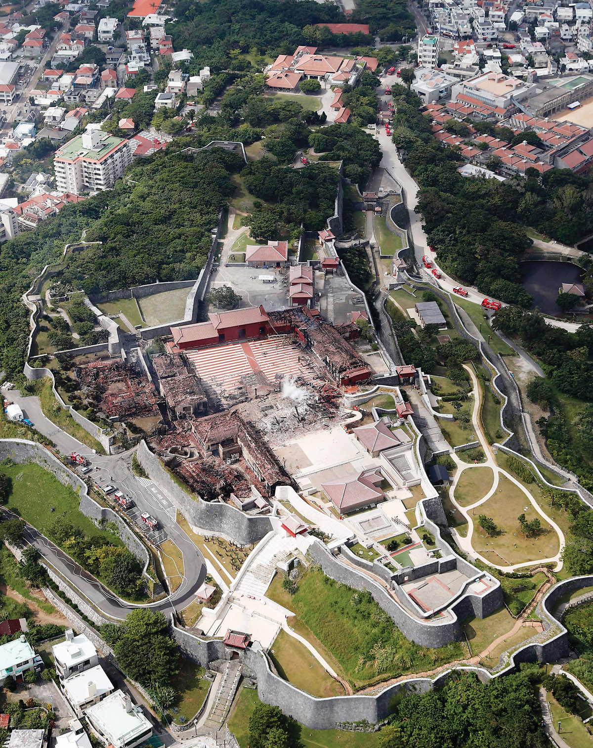 NHK에 따르면 31일 오전 2시40분께 슈리성에 화재가 발생했다는 신고가 들어온 뒤 소방차 30대가 출동해 진화작업에 나섰다. 그러나 슈리성의 중심 건물인 정전 외에 북전과 남전·반도코로 등 성내의 건물 7채가 모두 소실됐다. 또 정전 등에 보관된 상당수의 문화재가 불에 탄 것으로 알려졌다.