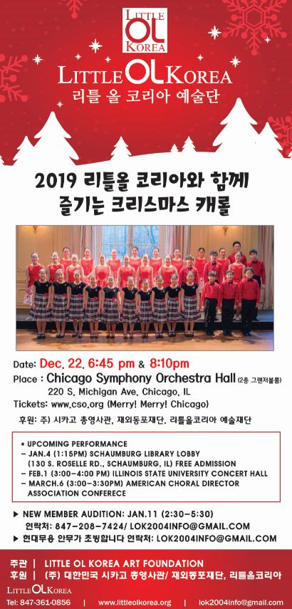 리틀올코리아예술단이 출연하는 크리스마스 캐롤 공연 ‘메리, 메리 시카고!’(Merry, Merry Chicago!)는 오는 22일 오후 6시45분과 오후 8시10분 두차례에 걸쳐 시카고심포니오케스트라홀 2층 그랜저볼룸에서 열린다. 총영사관, 재외동포재단, 리틀올코리아예술재단이 후원하는 이번 공연의 티켓은 시카고심포니오케스트라 웹사이트(www.cso.org)에서 구매할 수 있다.