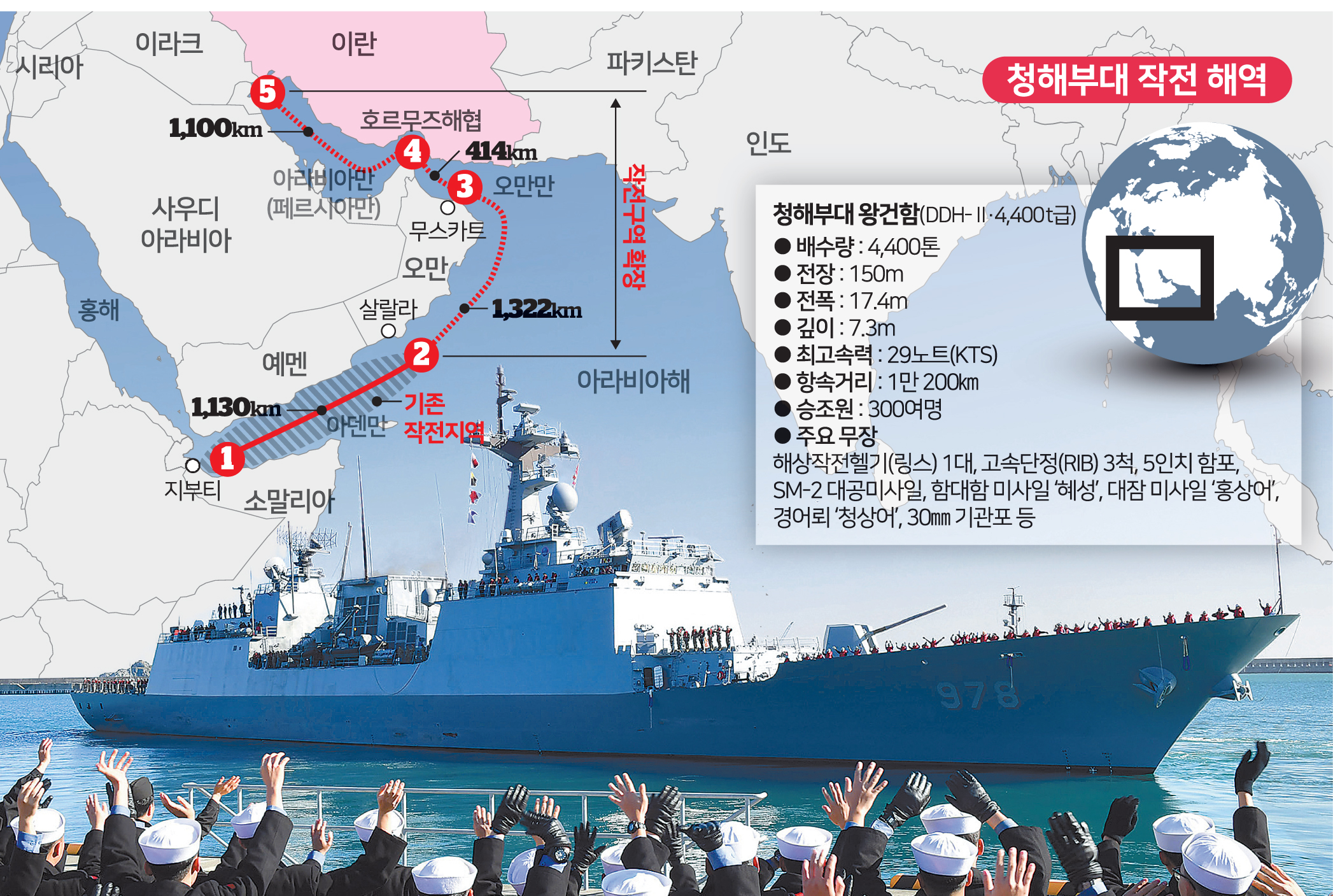 정부의 파견 지역 확대 결정에 따라 청해부대 작전 지역은 3,966㎞로 늘어나게 된다. 종전보다 3.5배가량 확대된 셈이다. 청해부대는 그간 소말리아 지부티항부터 오만의 살랄라항에 이르는 아덴만 해역 1,130㎞에서 해적에 맞선 선박호송 임무를 해왔다. 이번 결정으로 살랄라항부터 아라비아만(페르시아만)까지 총 2,830㎞가 작전 지역에 새로 포함됐다.