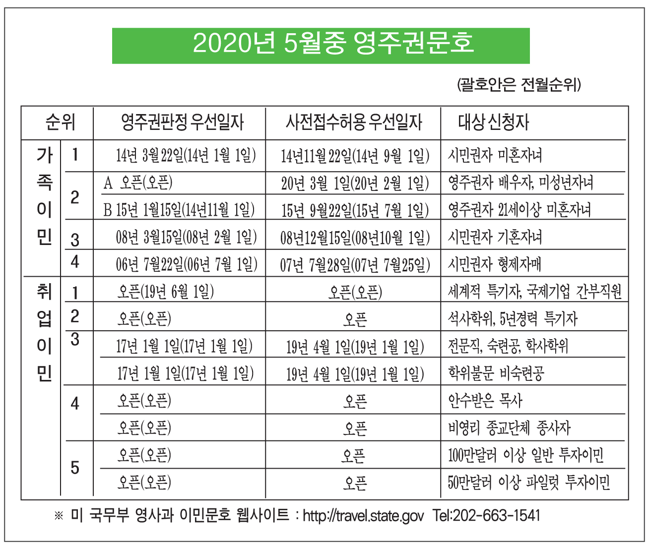 연방국무부가 24일 발표한 2020년 5월 영주권 문호에 따르면 취업이민 1순위는 우선 수속일자가 수개월 만에 없어지고 문호가 활짝 열렸다. 4월 문호에서 1순위 영주권 승인 판정일(Final Action Date)이 2019년 6월1일 이었던 점을 감안하면 약 1년 진전된 셈이다.