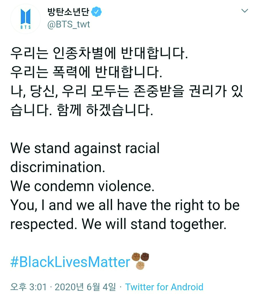 K팝 팬덤이 온라인에서 벌어지는 미국내 인종차별 항의 시위에 적극적으로 동참하는 이유 중 하나는 이들이 좋아하는 가수들이 인종차별에 반대한다는 목소리를 공개적으로 냈기 때문으로 보인다. 방탄소년단은 전날 공식 트위터에 ‘흑인의 생명도 중요하다’는 해시태그와 함께 “우리는 인종차별에 반대합니다. 우리는 폭력에 반대합니다. 나, 당신, 우리 모두는 존중받을 권리가 있습니다. 함께 하겠습니다”라는 글을 한국어와 영어로 올렸다.<사진>