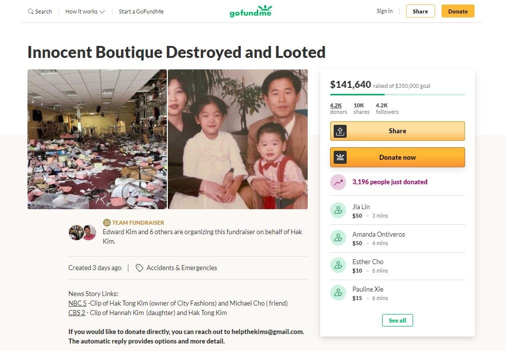 김씨는 피해 규모가 35만달러에 달한다고 밝혔다. 하지만 현재 법적 책임 보험만 가입된 상태여서 피해 보상을 받을 길이 없다. 김씨는 “얼마 전 보험금 청구를 한 번 했더니 보험료가 3배나 뛰었다. 억울한 생각이 들어 최근 보험을 해지하고 보험사를 바꾸려는 과정에서 생각지도 못하게 사고가 닥쳤다”고 설명했다. 망연자실해 있는 김씨를 위해 두 자녀가 나서 지역사회에 사연을 알렸고, 지인들과 함께 모금운동을 시작했다. 김씨의 안타까운 사연은 현지 방송에 소개되기도 했다. 김씨는 “모금 사이트에 올라온 응원 메시지들을 하나씩 읽어가는 데 정말 고마워 눈물이 다 났다”면서 “많은 이들이 자기 일처럼 가슴 아파했고, 매장을 다시 열 수 있도록 의지를 북돋으려 했다”며 감동을 전했다. 그는 “가족 누구도 모르는 사람들이 거액의 기부금을 선뜻 내놓는 걸 보고 놀라기도 했다. 짧은 시간에 그렇게 많은 성금이 모일 줄은 상상도 못 했다”고 부연했다. 이어 이번 폭동의 피해로 타격을 입은 한인업주들이 생각보다 많다면서 “그들에게도 관심과 성원이 닿을 수 있기를 바란다”고 말했다.