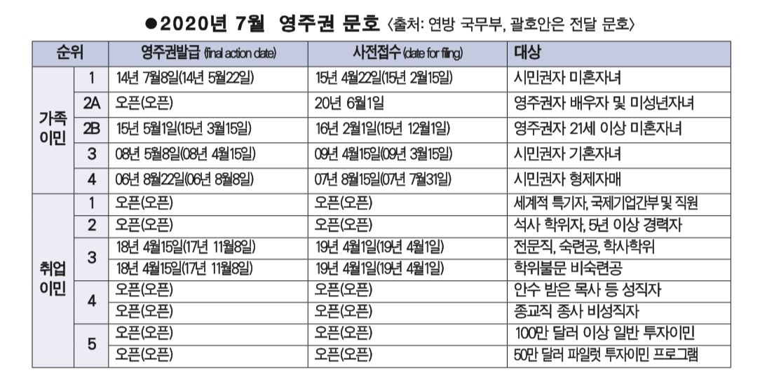 연방 국무부가 16일 공개한 2020년 7월 영주권 문호에 따르면 취업 3순위 숙련공과 비숙련공 부문의 영주권 승인 판정일(Final Action Date)은 2018년 4월15일로 전월 대비 5개월 1주일 앞당겨졌다.