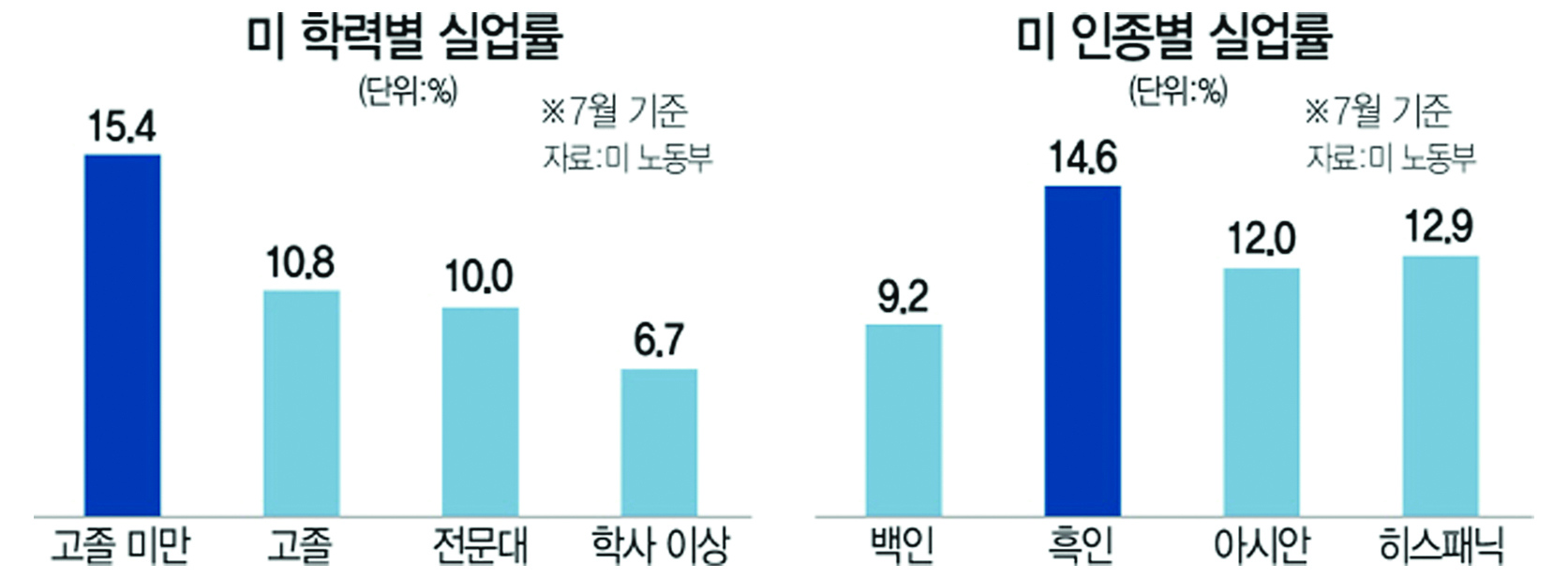 학력별 차이도 크다. 코로나19로 원격근무가 도입됐지만 이는 대학교육을 받은 직원들 위주로 가능한 실정이다. 연준에 따르면 학위 소지자의 63%는 회사업무를 집에서 처리할 수 있지만 고등학교 졸업 이하의 근로자는 그 비율이 20%에 불과했다.
