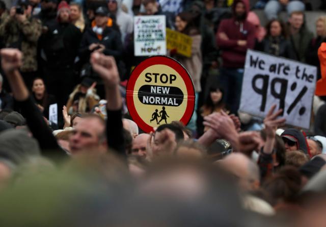 26일 영국 런던 트라팔가광장에서 수천명의 시민들이 코로나19 방역을 위한 이동제한 조치에 항의하는 집회를 열고 있다.<런던=AP 연합>