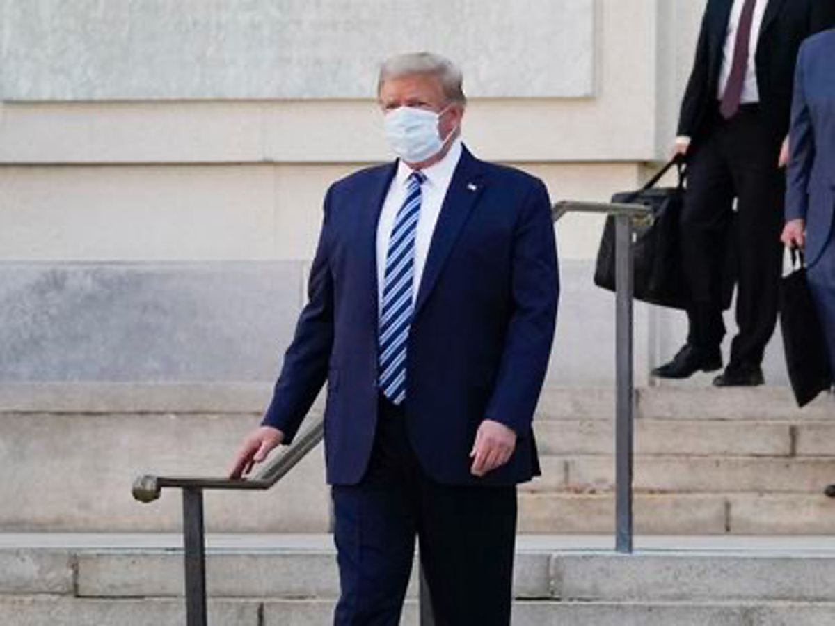 흰색 마스크를 쓰고 모습을 드러낸 트럼프 대통령은 취재