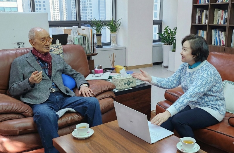 대전 롯데백화점 3층 ㈜세창 사무실에서 박종윤 회장(사진 왼쪽)과 본지 특파원이 인터뷰를 하고 있다.