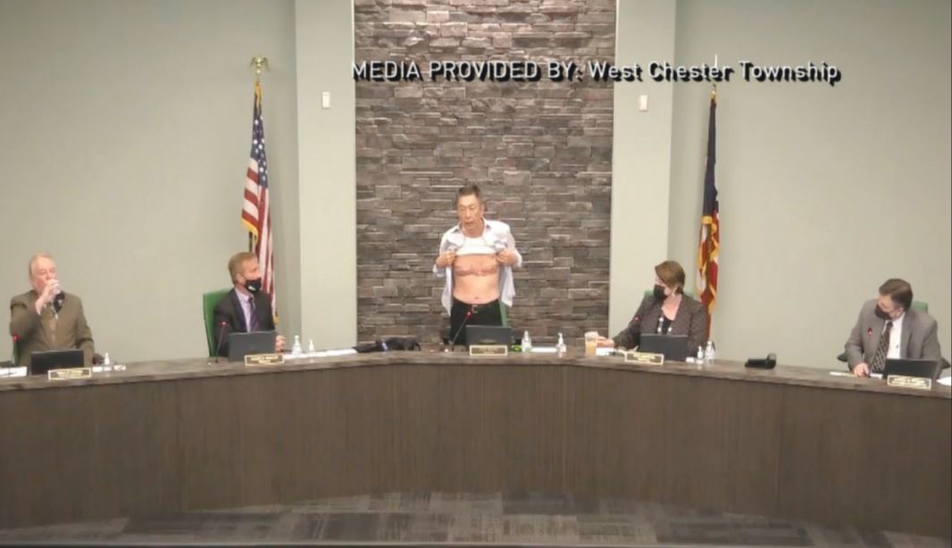 오하이오주 웨스트 체스터의 타운홀 미팅에서 셔츠를 벗으며 큰 흉터를 내보이는 리 웡.[WKRC TV 캡처]