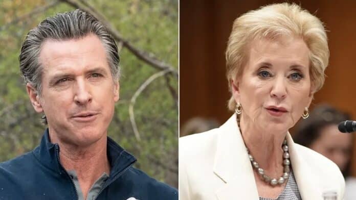 린다 맥마흔 장관이 캘리포니아주의 타이틀 IX 위반을 발표하며, 정책 수정을 10일 내에 요구한 후, 뉴섬 주지사실의 엑스계정은 맥마흔이 과거 WWE 쇼에서 바디 슬램을 당하는 영상을 게시해 파문을 일으켰다. 이 영상은 남성이 여성을 물리적으로 제압하는 장면이라, 생물학적 남성의 여학생 스포츠 참여를 반대하는 이들의 주장을 역설적으로 강화했다는 비판을 받았다.