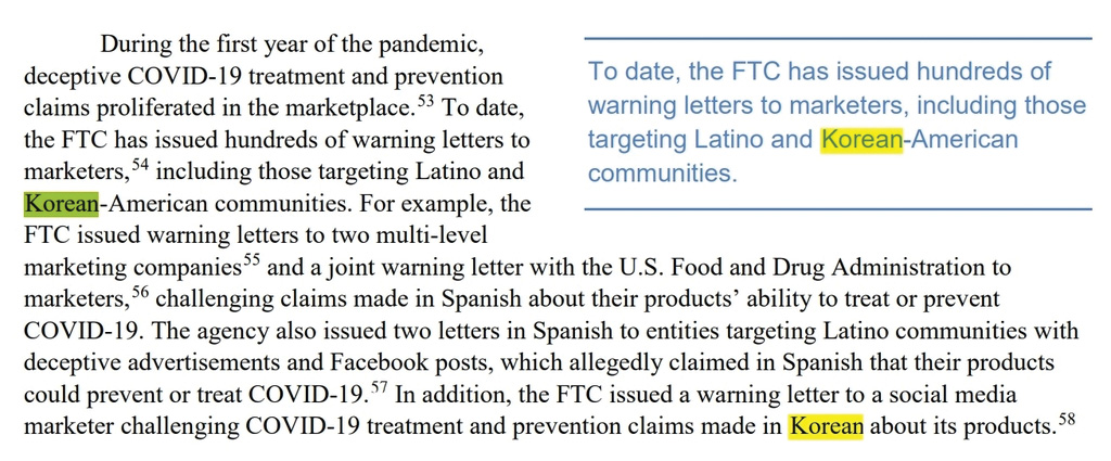 FTC는 한인과 라티노 커뮤니티를 겨냥해 이런 상품을 판매하는 업체에 수백여 장의 경고 편지를 발송했다고 밝혔다. FTC는 소셜네트워크상에서 코로나19를 예방·치료한다고 한국어로 광고한 업체에 경고 편지를 발송한 예를 들었다.