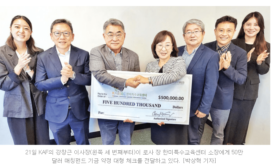 미주 한인사회 최초의 커뮤니티 재단인 KAF(Korean American Foundation·이사장 강창근)는 발달장애 서비스 비영리단체인 한미특수교육센터(KASEC·소장 로사 장)에 향후 5년간 매년 10만 달러씩 매칭펀드 그랜트 50만 달러 지원을 약속하고 전달식을 가졌다.