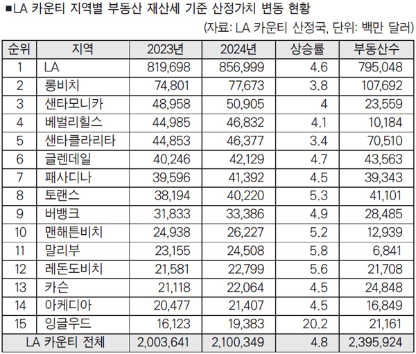 시 별로 LA카운티에서 가장 높은 LA시는 작년 8,196억9,847만3,001달러에서 4.6% 증가한 8,569만9,913만5,980달러로 나타났다. 이어 롱비치 시가 작년 748억179만1,259달러에서 3.8% 늘어난 776억7,319만898달러를 기록했다.